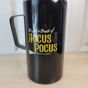 For sale is a mug from Disney. It is in new, unused condition without tags. This black stainless steel tumbler mug says "it's just a bunch of Hocus Pocus" on one side, and has the Sanderson sisters Winifred, Sarah, and Mary on the other side in yellow, green, orange and blue tones. It has a clear lid, perfect for travelling and taking your brew on the go. Measures about 6.5" tall with the lid on it.