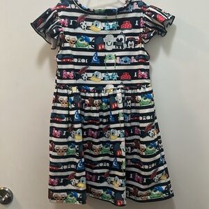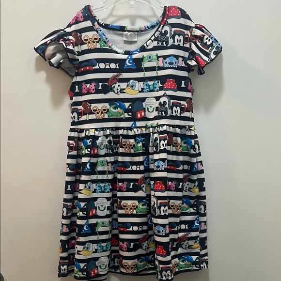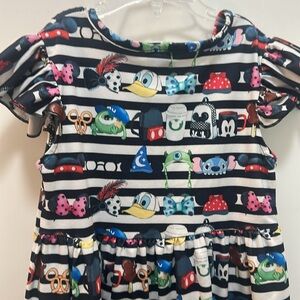 Disney Colorful Kids Dress - Assortment of Disney Hats on a Black & White Stripe background - fits age 4-6. Tag says size Large. This vibrant kids' dress features a playful cartoon print, perfect for adding fun to any day or a Disneyland adventure! The colorful design is sure to delight.