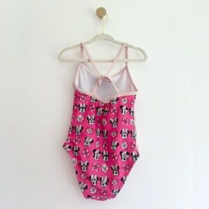 ADORABLE Disney Minnie Mouse pink swimsuit featuring ruffle accent and crisscross back straps with cute bow. Perfect for any Minnie Mouse enthusiast.