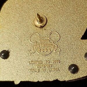 This Valentine's Day themed pin pays tribute to one of Chip 'n' Dale's most famous shorts "Two Chips and a Miss". The main body of the pin features a full image of lounge singer Clarice in a green dress and a yellow boa with a yellow flower on her head. Separate pin-on-pin hearts show Chip's and Dale's heads, both with collars and bowties. Front of the pin also reads "Happy Valentine's Day! 2004 Walt Disney World".