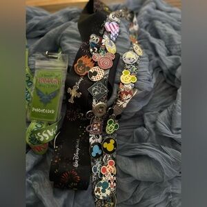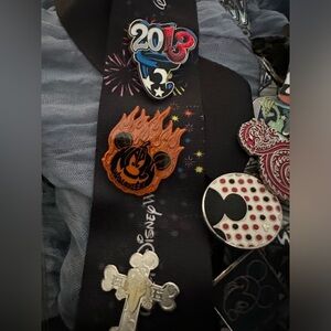 Walt Disney world fireworks lanyard with 2013 magic hat pin, pumpkin Mickey face, cross pin