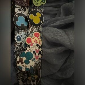 Mickey, Pluto comic strip lanyard with 20 Mickey head or ear pins, 1 eeyore!