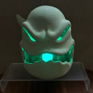 When not lit, it's Oogie Boogie's head. When lit, the LED throws flickering light across your space, appropriate for a seance, ghost stories, or movie night.