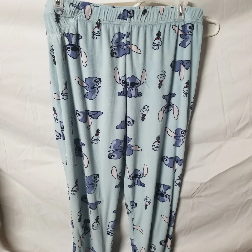 Soft pajama pants featuring allover Stitch character print. Light blue fabric with navy and pale pink details. Elastic waistband for comfortable wear. Great for lounging or sleep.