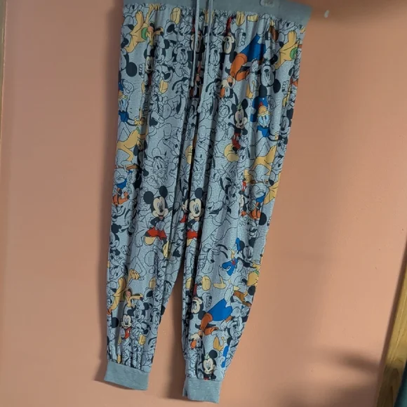 Light gray pajama pants with allover Mickey Mouse and friends print. Elastic waistband with drawstring for a snug fit. Ribbed ankle cuffs for comfort. Soft, breathable fabric for lounging or sleep.