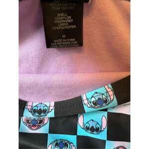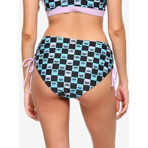 Check out the summer with these swim bottoms from Lilo & Stitch! Printed all over with a black and blue checkered pattern with Stitch's face in the blue checks. Featuring side gathers with lilac tie straps.