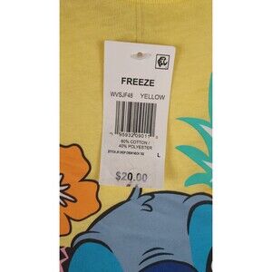 The product is a large crop crew neck tee shirt featuring the characters from the Disney movie Lilo & Stitch. It is in a vibrant yellow color, making it a bright and fun addition to any wardrobe. This tee is suitable for adult girls who are fans of the Disney franchise and want to showcase their love for the lovable alien creature Stitch. The shirt is officially licensed by Disney, ensuring high quality and authenticity.