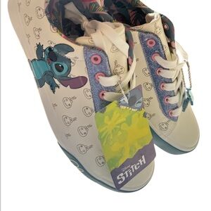 These Disney Stitch kids sneakers feature a playful design with vibrant white and blue colors. Perfect for little fans of Stitch, these shoes offer comfort and style for everyday adventures.