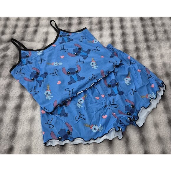 The Disney Lilo and Stitch Pajama Set for women is a fun and comfortable sleepwear option featuring a sleeveless cami style top with a graphic print of Stitch from the beloved Disney movie. Made of lightweight polyester material, this pajama set is machine washable and comes in a size XL in a beautiful blue color. Perfect for fans of Disney and the lovable character Stitch, this pajama set is a must-have for a cozy night's sleep.