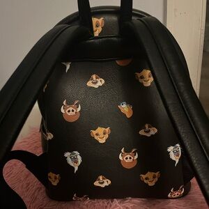 Black mini backpack featuring Lion King characters. Gold zipper accents.