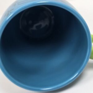 Vibrant blue mug featuring Ariel design. Green handle with unique fork detail.