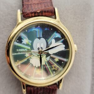 The Disney Lorus Hologram Watch featuring Mickey Mouse is a contemporary collectible timepiece that showcases the beloved Disney character in a unique hologram design. Made by Lorus, this unisex watch is a must-have for Disney fans and collectors. With a new battery installed, this watch is ready to keep time and display the iconic Mickey Mouse image for years to come.
