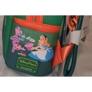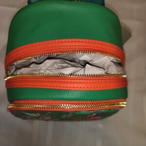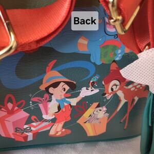 This Christmas Disney Loungefly has so many Disney characters on it, and the Christmas lights on the front will glow in the dark. This one actually has 2 zipper compartments instead of just the one. Also 2 small side pockets. Green in color, the little stitch on front slides a little to change his position. Zipper pulls and hardware are a gold-tone. This measures approximately 10" x 8". It has a little tag on it that I believe is showing that it will somehow hold a pair of Disney ears.