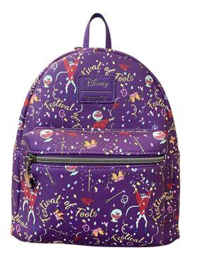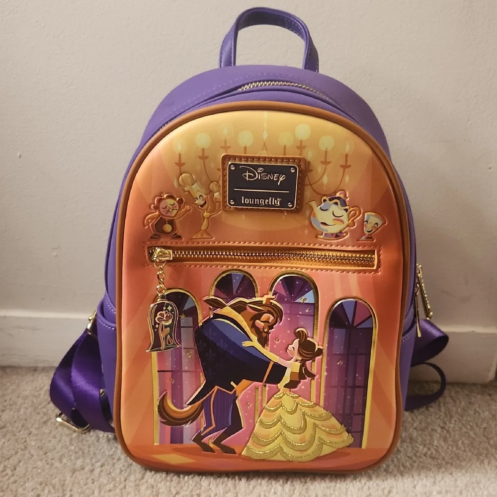 Purple and orange mini backpack featuring Beauty and the Beast design. Perfect for Disney fans.