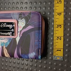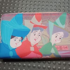 This zip-up wallet showcases Princess Aurora Maleficent on the front, while the back reveals the three fairies tenderly watching over Aurora's crib.