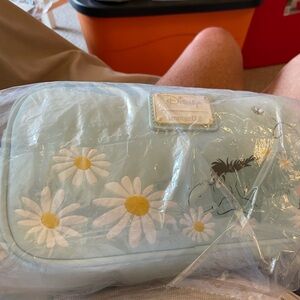 Charming Disney Loungefly bag featuring Winnie the Pooh and Piglet. Adorned with daisies and a bee. Light blue background with yellow accents.