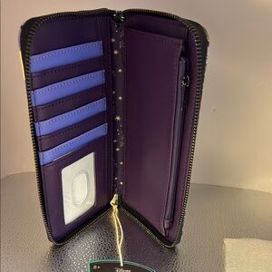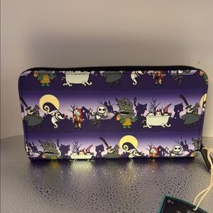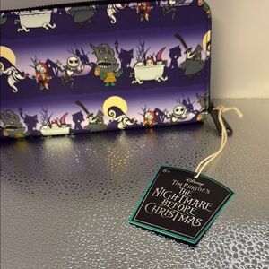 This adorable lounge flight Disney Tim Burton’s the nightmare before Christmas is new with tags. The inside has one zippered pocket and nine slots for credit cards and one slot for your identification. The measurements of the wallet is 9 inches long and 4 1/2 inches wide. It is new with tags. It’s a zip around the whole wallet so it keeps your valuables secure.