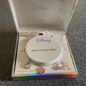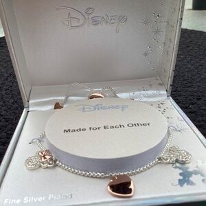 New Disney brand, Made for Each Other adjustable bracelet. Minnie & Mickey Mouse and heart. Fine silver plated. Never taken out of original packaging of Disney Box. Retails new at $50.