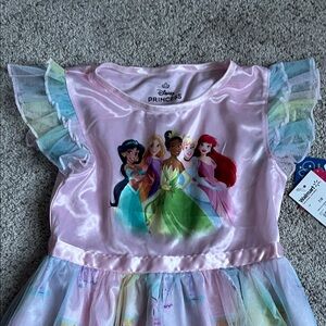 Flutter sleeve nightgown with enchanted castle print. Features magical motifs on skirt. Ruffled mesh sleeves in rainbow pastels. Soft and dreamy design. New with tags.