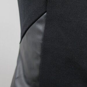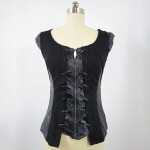 Zip front with corset look. Faux leather and ponte knit. Cap sleeves. Ribbon lacing. Feels a little bit goth, a little bit ren faire.