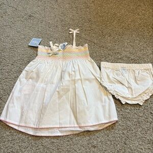 Adorable Disney dress and bloomers set in white, perfect for your little one. Features a charming design with colorful accents.
