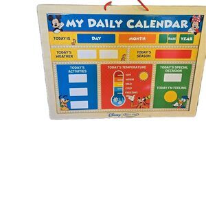 The Disney Melissa & Doug Mickey Mouse Clubhouse My Magnetic Daily Calendar is a wooden toy featuring characters from the Mickey Mouse & Friends series. Recommended for children ages 3 and up, this magnetic calendar allows kids to engage in imaginative play with their favorite Disney characters. With both educational and entertainment value, this toy promotes creativity, storytelling, and cognitive development in young children. Use white board on back also