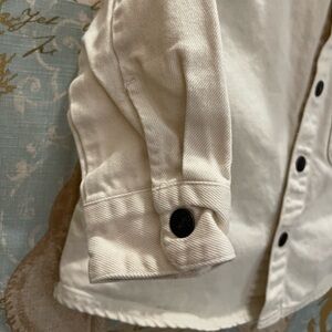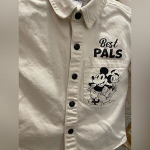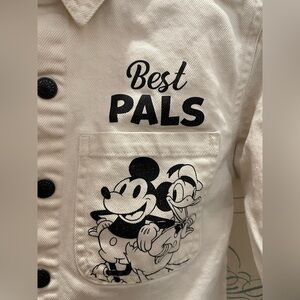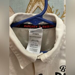 Unisex Mickey Mouse and friends Walt Disney button up jean jacket available and the color cream. Size 2T, excellent pre-love condition very colorful on the backside with Micky and the gang hanging out ships from a smoke free home.