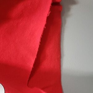 Mickey, Donald and Goofy in holiday hats vinyl decal design on solid red sweatshirt Cropped raw edge at bottom hemline Finished neckline and cuffs 60% cotton, 40% poly PtoP medium 20", shoulder to hem 18" PtoP large 21", shoulder to hem 19" PtoP XL 22.5", shoulder to hem 19"