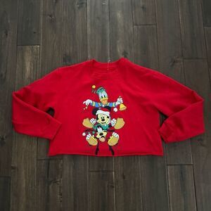 Disney Mickey & Friends Red Cropped Holiday Christmas Pullover Sweatshirt. Features Mickey Mouse, Donald Duck and Goofey. Size Jr. L. Worn once!