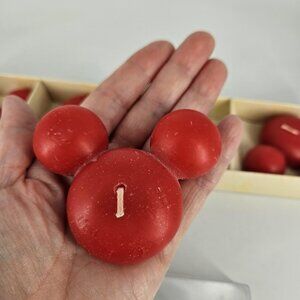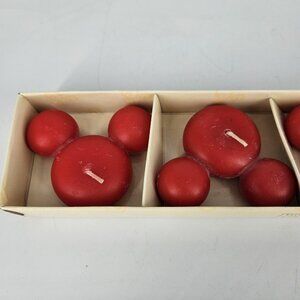 Design: Round red floating candles molded in the shape of Mickey's head with two smaller round "ears" attached to a larger round base.