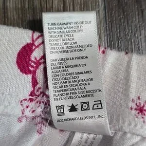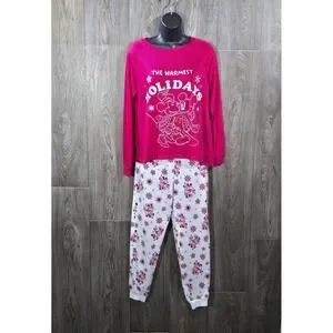Snuggle up for "The Warmest Holidays" in this adorable Disney Mickey and Minnie Mouse pajama set! This soft two-piece set includes a long-sleeve raglan top in "Rose Sangria" (a festive pinkish-red) featuring a charming white graphic of a hugging Mickey and Minnie in winter gear, complete with the holiday slogan and snowflakes. The matching pants feature an all-over print of Mickey and Minnie with snowflakes on a white background. The fabric is a comfortable and slightly stretchy blend (95% Polyester, 5% Spandex) perfect for lounging, sleeping, or Christmas morning photos!