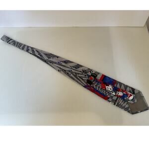 Fun and collectible vintage Disney tie featuring Mickey and Minnie Mouse dancing in a retro diner scene with Goofy at the DJ booth and a colorful jukebox in the background. 1990s design with a bold gray, red, and blue color palette. Made from 100% polyester. A great gift for Disney fans, collectors, or to add personality to any outfit.