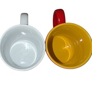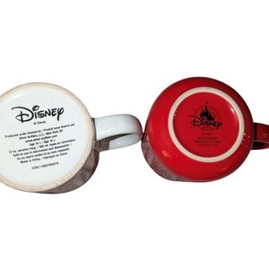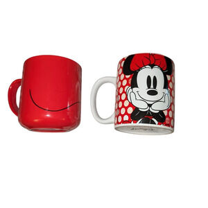 Adorable Disney mugs with Mickey and Minnie designs. Bright red and yellow colors.