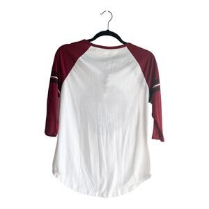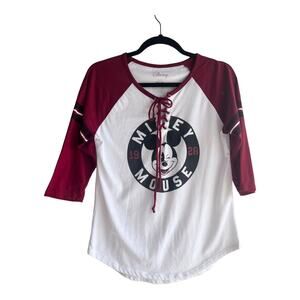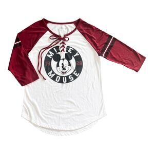 • Mickey Mouse Baseball Style Jersey Shirt For Her. Tie Front, 3/4 Sleeves In White and Burgundy.