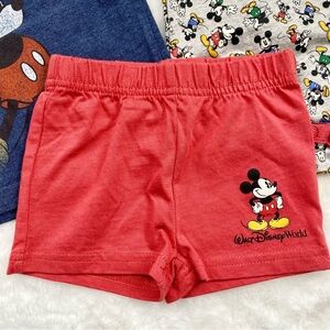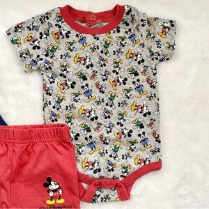 Adorable Disney Mickey Mouse baby outfit set. Includes a blue t-shirt, red shorts, and a colorful onesie with Mickey Mouse prints.