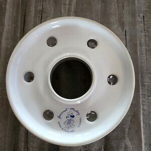Add a touch of Disney charm to your kitchen or home décor with this Gourmet Mickey Mouse ceramic candle topper or jar lid holder. Designed with blue and white detailing and Mickey head cutouts, this piece features the "Gourmet Mickey" chef logo on the bottom and is Made in Thailand.