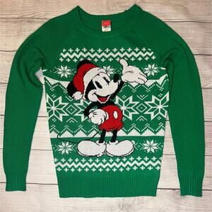 Disney Mickey Mouse Christmas Sweater Green Snowflake Pattern XS