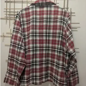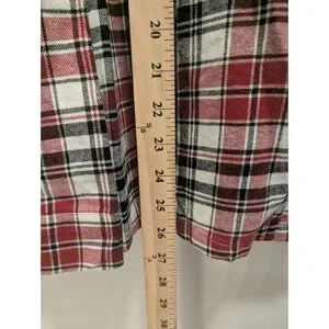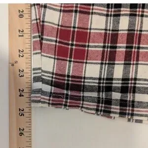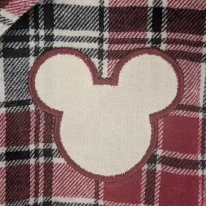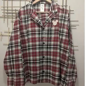 Disney Mickey Mouse plaid pajama set for women. Featuring a classic red black and white plaid pattern with logo embroidered chest pocket and leg of the pants. The top has a collared neckline and button front closure. The pants have an elastic waistband for comfort. Perfect for cozy nights at home or your next trip to the parks! NWT