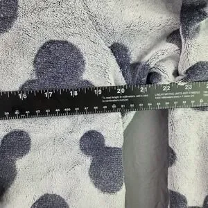 Plush faux fur union suit features an all-over Mickey Mouse silhouette print in a classic navy and grey color scheme. Designed for ultimate comfort, this one-piece includes a full-zip front, cozy hood with 3D ears, and playful pom-pom drawstrings. Functional front pockets and ribbed cuffs complete the look, making it a perfect choice for lounging at home, themed sleepovers, or festive holiday mornings. This item is in excellent condition.
