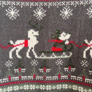 Adorable cozy Christmas sweaters featuring Mickey Mouse being pulled in a sleigh by a reindeer with antlers! Fair isle pattern in gray, red, white, and green. Very Festive! Perfect for holidays in the park.