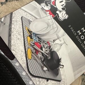 Two-pack of Disney dish mats featuring Mickey Mouse. Gray polka dot design with black accents. Adds charm to your kitchen.