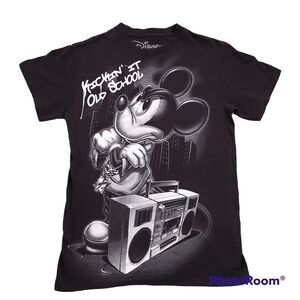 Disney Mickey Mouse Hip Hop Kickin It Old School Tshirt sz Small. Black white and grey full front graphic with 90s mickey and boom box. Good used condition, don't see any holes or stains. May run a little small. Flat measurements approximately
