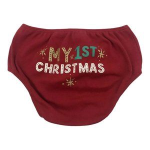 Diaper cover with elasticized waist and leg holes features gold glitter