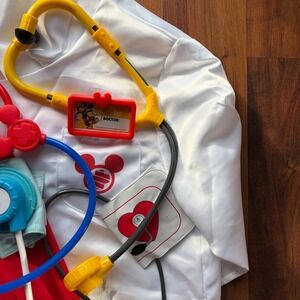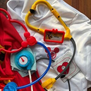 Inspire hours of creative roleplay with this Disney Mickey Mouse dress-up set featuring three iconic career outfits. This comprehensive bundle includes a red firefighter tunic with a "Fire Chief" badge, a white doctor's lab coat with a Mickey stethoscope and blood pressure cuff, and a yellow construction vest complete with plastic tools like a hammer, thermometer, and walkie-talkie. Each piece is designed with signature Mickey Mouse silhouettes and bright, engaging colors, making it perfect for toddlers and young children who love to imagine themselves as everyday heroes.