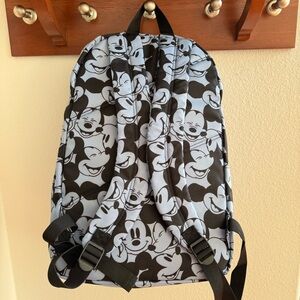Disney Mickey Mouse full size lightweight backpack in light blue with happy Mickey facial expressions. Back is slightly padded as are adjustable straps. One interior laptop pocket, double zip top closure with covered zipper. Small zip front pocket.