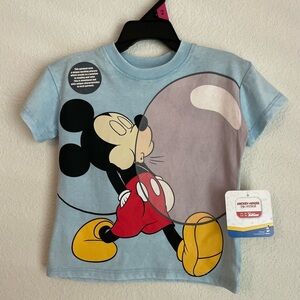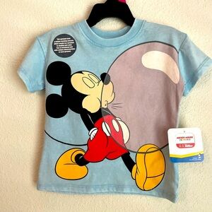 Light blue tee with Mickey Mouse graphic. Features classic Disney charm.