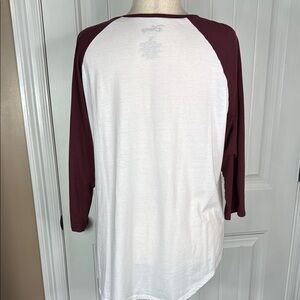 Charming Mickey Mouse design on a white shirt with maroon sleeves. Ideal for Disney fans.Good Pre- Owned Condition. Pit to Pit 25” Length 27”