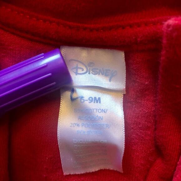 Disney Mickey Mouse Outfit - Embroidered "My First Christmas" on the front along with Mickey holding a stack of presents. Red velour material, full-zip/snap closure. Very good condition, the inside size tag is written on (pictured). Smoke free home.