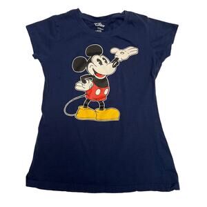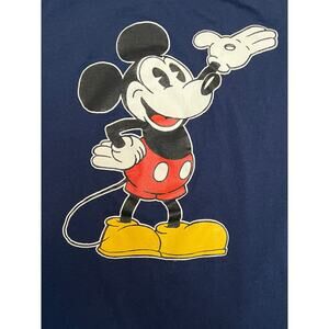 This is a classic Disney Mickey Mouse graphic T-shirt in navy blue. The shirt features a vintage-style Mickey Mouse print, making it perfect for Disney fans and collectors alike.