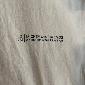 Description: Oversized white shirt with vintage Mickey Mouse on front. "Mickey and Friends Genuine Mouseware" text on the back lower right.
